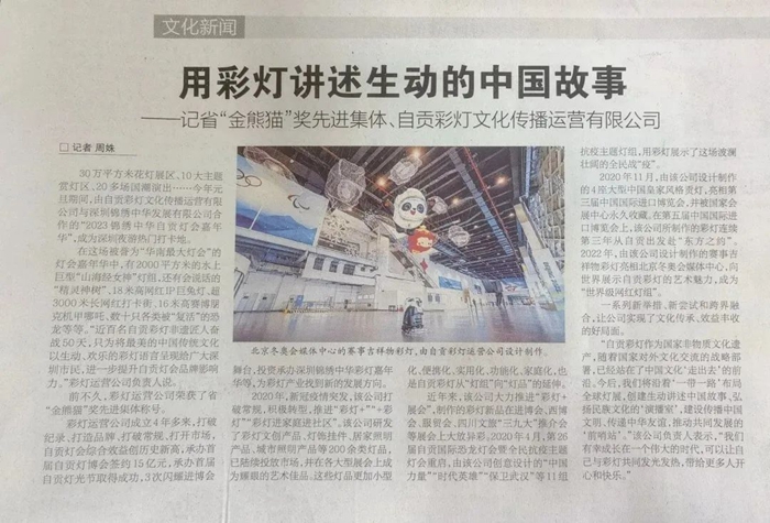 2020年11月,由該公司設計制作的4座大型中國皇家風格貢燈,亮相第三屆中國國際進口博覽會,并被國家會展中心永久收藏。在第五屆中國國際進口博覽會上,該公司所制作的彩燈連續(xù)第三年從自貢出發(fā)赴“東方之約”。2022年,由該公司設計制作的賽事吉祥物彩燈亮相北京冬奧會媒體中心,向世界展示自貢彩燈的藝術魅力,成為“世界級網紅燈組”。
